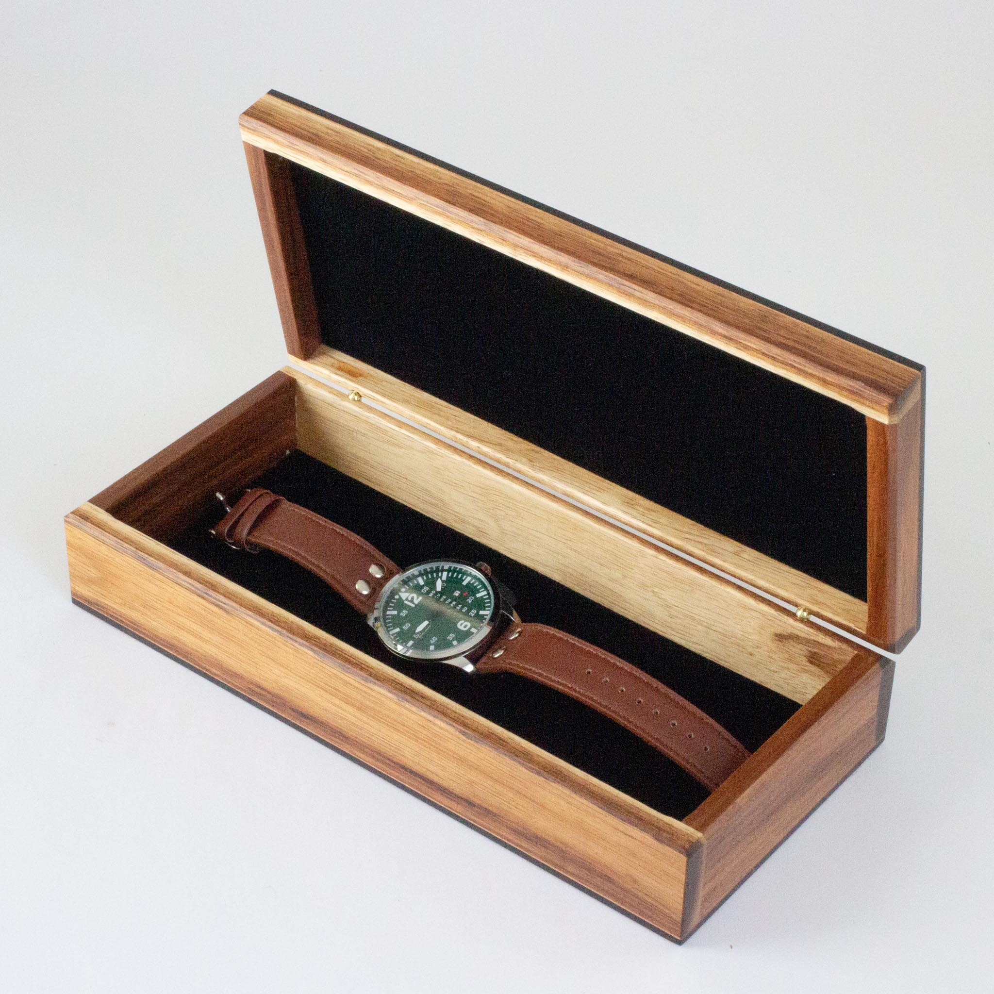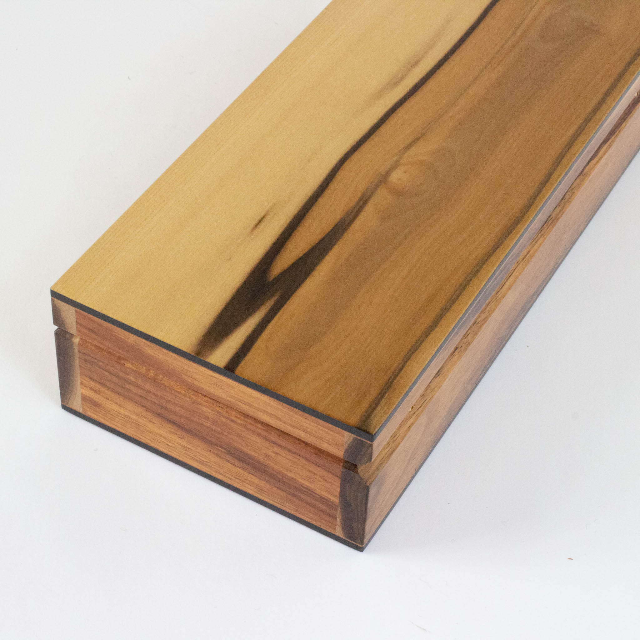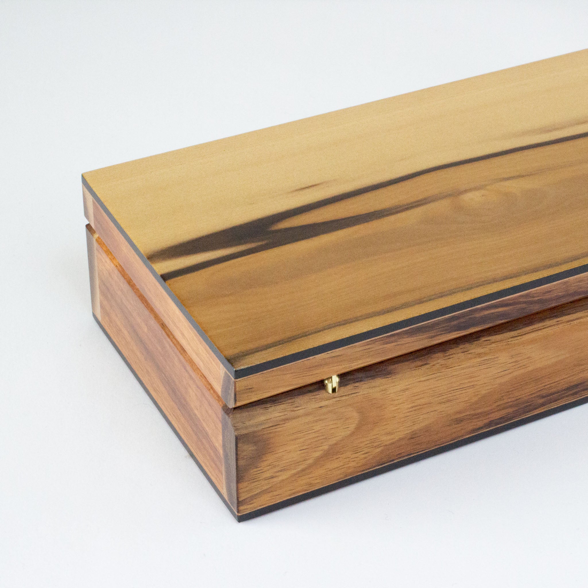 The Hawthorne Sassafras Long Box has been handcrafted with a solid Blackwood body, finished with a highly figured Blackheart Sassafras lid. The interior is felt-lined, and the lid is held by two discreet solid brass hinges. This box comfortably holds a man's watch with room for other sundries and also works well for jewellery or other collections. Presented in a box that is perfect for gift wrapping, it makes a perfect gift for friends or family—a classic gift that suits many different occasions.