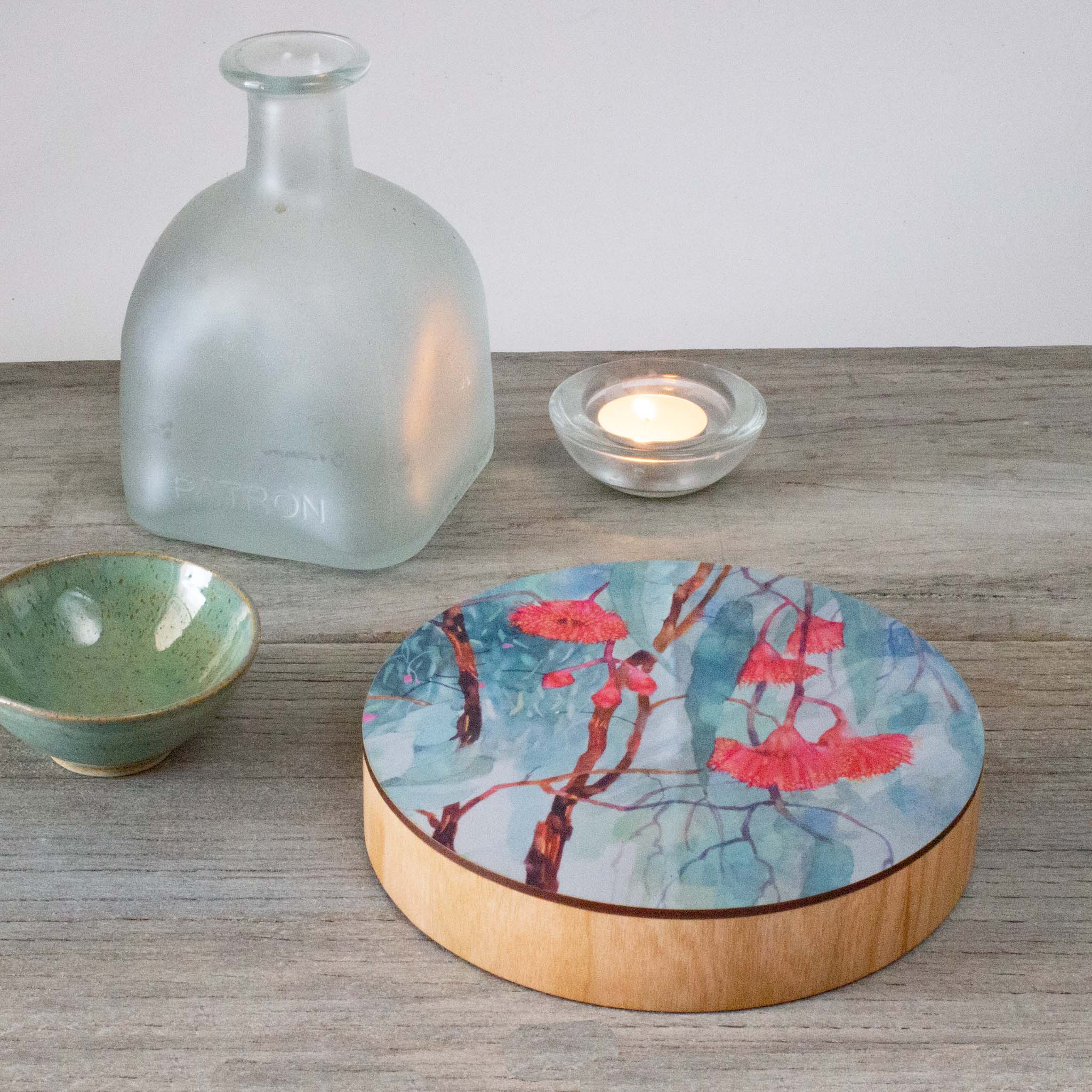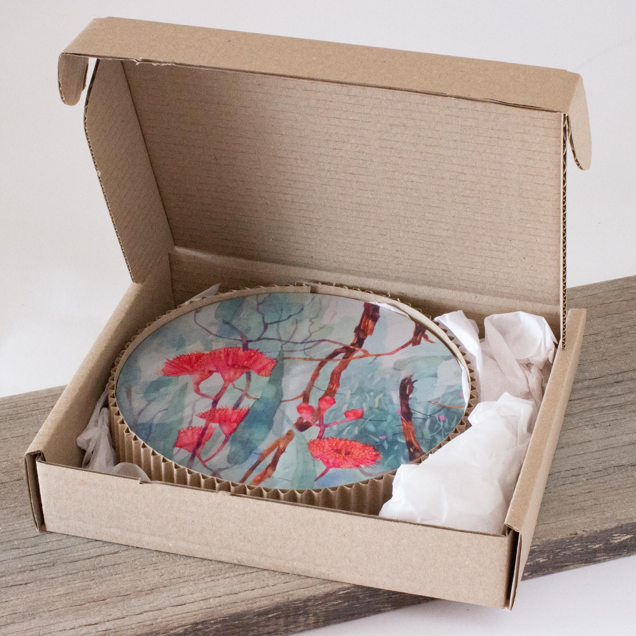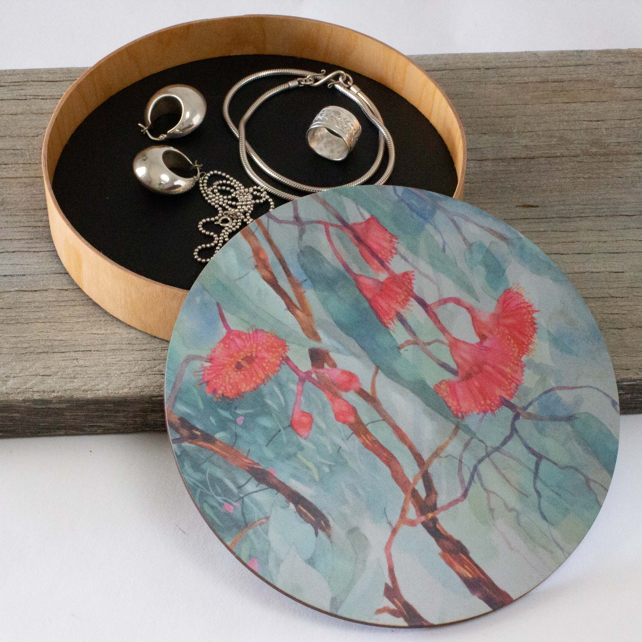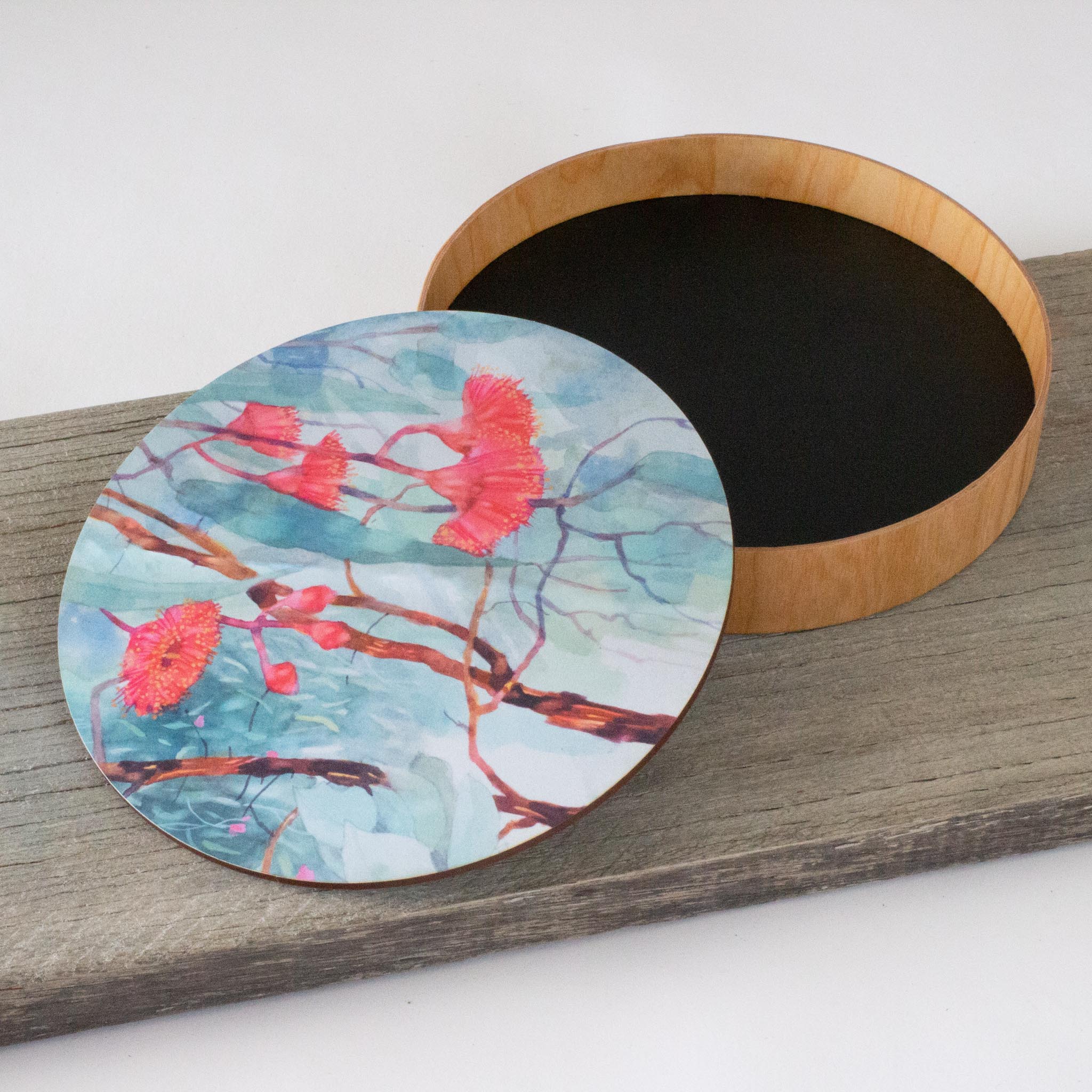 This elegant box personifies modern style. The lid features a print of an original painting by Adrienne Williams, a landscape artist from Queensland, and captures dreamy images of a flowering gum. The subtle details in the making of this box have been carefully considered and are there for a purpose: the scallops in the base for strength, while the scallop on the side locates your thumb for lifting the lid.